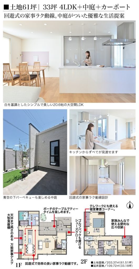 | 土地面積 | 1号地 203.37㎡ / 61.51坪 | 建物面積 | 109.72㎡ / 33.18坪(延床) |