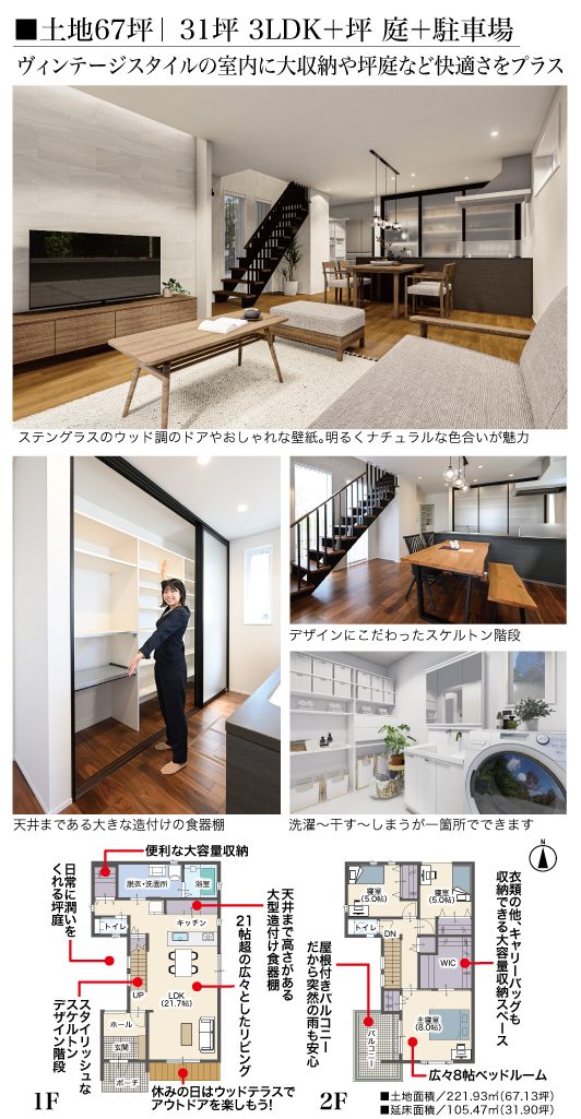 | 土地面積 | A号地 221.93㎡ / 67.13坪 | 建物面積 | 105.47㎡ / 31.90坪(延床) |