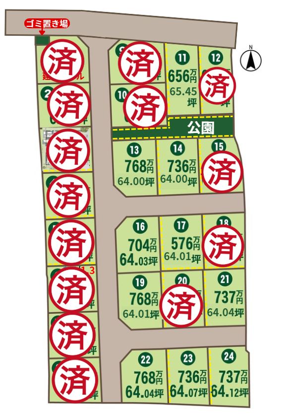 価 格 | 11号地 656万円 13号地 768万円 14号地 736万円 16号地 704万円 17号地 576万円 19号地 768万円 21号地 737万円 22号地 768万円 23号地 736万円 24号地 737万円 |