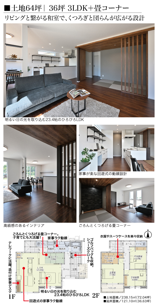 | 土地面積 | 1号地 238.15㎡(72.04坪) | 建物面積 | 121.10㎡ / 36.63坪(延床) |