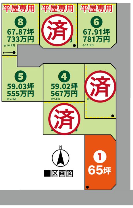| 土地面積 | 4号地 195.12㎡(59.02坪) 5号地 195.17㎡(59.03坪) 6号地 224.50㎡(67.91坪) 8号地 224.39㎡(67.87坪) |